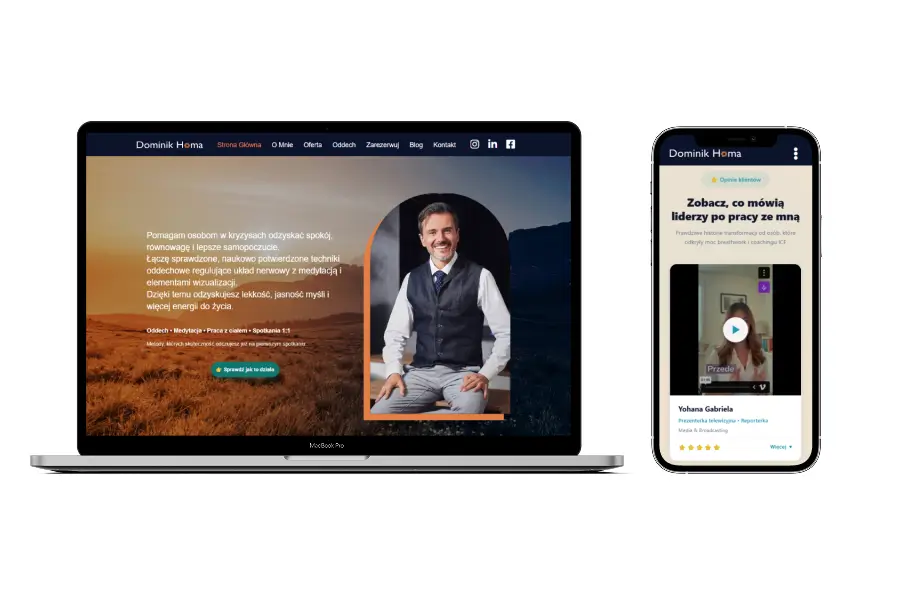 Certyfikowany coach i praktyk świadomego oddechu. Strona internetowa jest centrum jego marki osobistej, prezentującym ofertę sesji 1:1, warsztatów oraz eksperckich metod pracy.